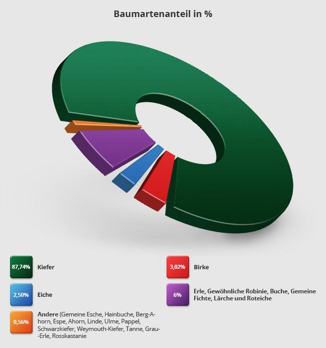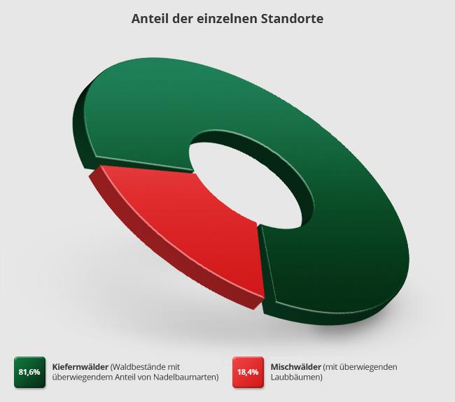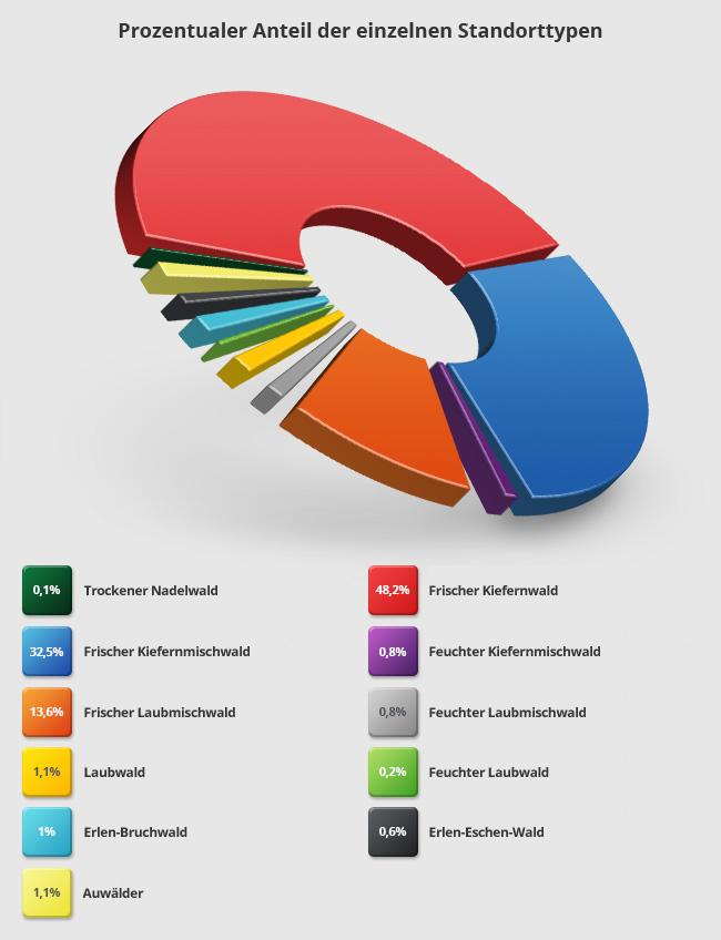 Zu den wichtigsten waldbildenden Gattungen gehören frischer Kiefernwald (81,6%) und frischer Laubmischwald (18,4%).