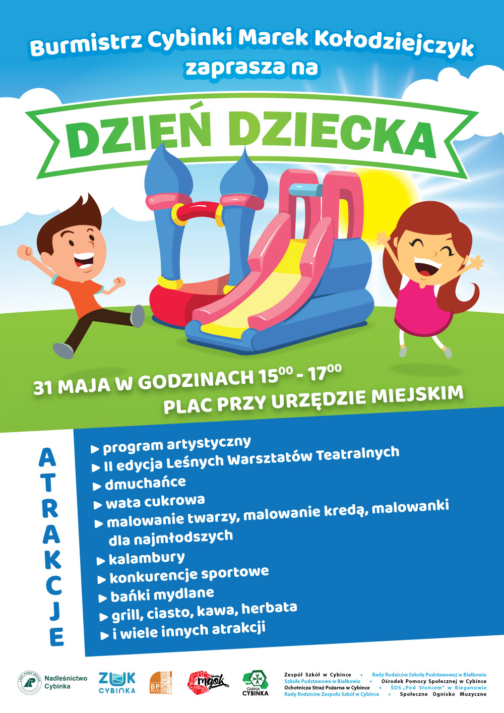 Nadleśnictwo Cybinka wraz z Burmistrzem Cybinki serdecznie zaprasza wszystkie dzieci, rodziców, dziadków i opiekunów na imprezę z okazji Dnia Dziecka, które przygotujemy w dniu 31.05.2019 r. od godz. 15:00 do 17:00. Szczegóły na załączonym plakacie.